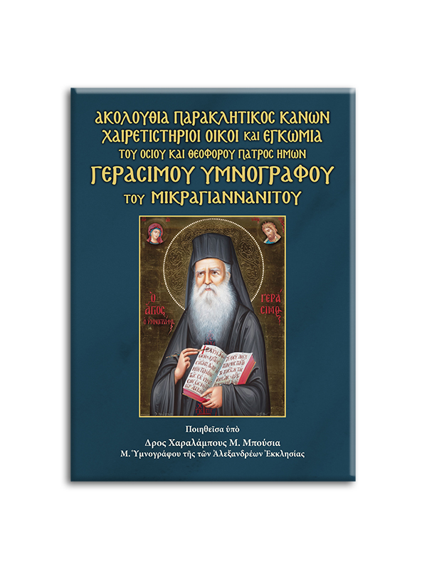 Ένα βιβλίο με την Ακολουθία, τον Παρακλητικό Κανόνα, τους Χαιρετισμούς και τα Εγκώμια του Οσίου Γερασίμου Υμνογράφου του Μικραγιαννανίτου, από τον Μεγάλο Υμνογράφο της των Αλεξανδρέων Εκκλησίας δρ. Χαράλαμπο Μπούσια.
